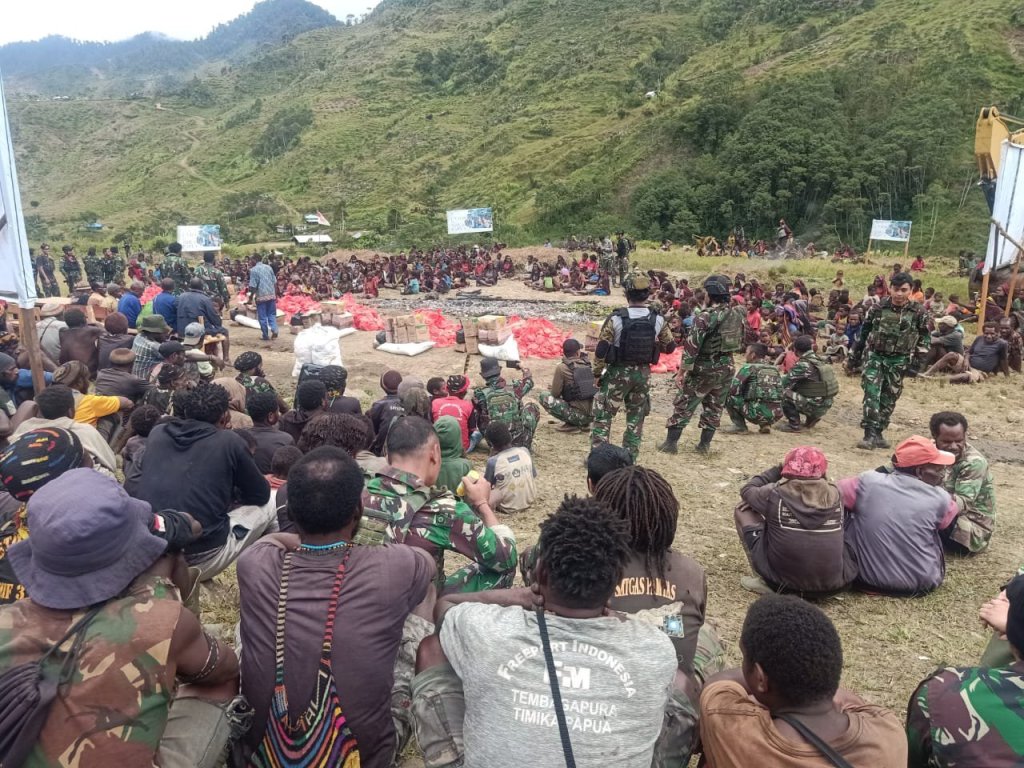 Jembrana – Papua | Mbua. Pemandangan yang sangat luar biasa, Ketika ribuan warga masyarakat dari 7 Gereja yang ada di wilayah Distrik Mbua berbaur menjadi satu dengan para TNI. Kedatangan ribuan warga tersebut tak lain untuk menghadiri undangan Koramil Persiapan Mbua dalam acara bakar batu dan pembagian sembako, Acara bakar batu tersebut berlangsung di halaman Koramil Persiapan Mbua dan diiringi juga dengan tari-tarian adat Papua, Selasa (1/11).