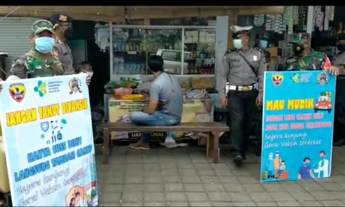 Patroli gabungan personel Koramil 1617-01/Negara bersama personel dari Polsek Negara kembali digelar dengan menyasar pusat aktivitas masyarakat dan pelaku usaha di sepanjang area pertokoan di wilayah Kecamatan Negara. Petugas gabungan pun mendatangi para pedagang pasar maupun pertokoan untuk mengingatkan agar mematuhi peraturan dalam pemberlakuan PPKM Level II dan mensosialisasikan vaksinasi, Selasa (19/04/2022)