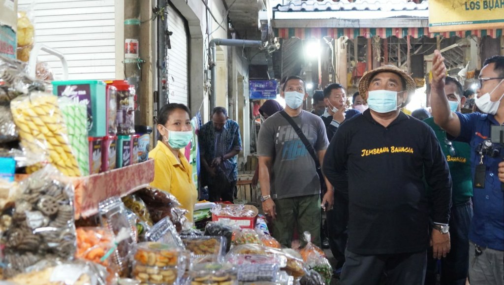 Jembrana – Menjelang hari raya Idul Fitri 1443 Hijriah, Bupati Jembrana I Nengah Tamba bersama Ibu Bupati Candrawati Tamba memantau secara langsung kestabilan harga dan pasokan komoditi pangan di Pasar Umum Negara, Jumat (29/4).