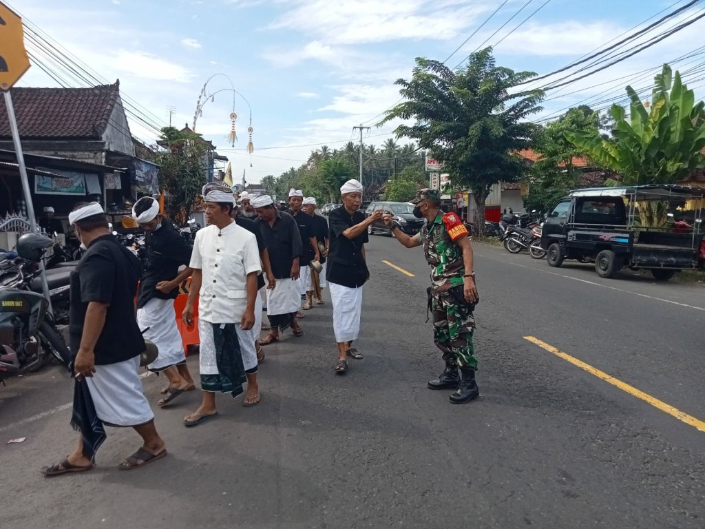 Jembrana – Babinsa Kelurahan Tegal Cangkring Koramil 1617-02/Mendoyo Serda Suwardi bersinergi dengan Bhabinkamtibmas dan Pecalang serta unsur pengamanan dari Polsek Mendoyo melaksanakan pengamanan saat berlangsungnya upacara