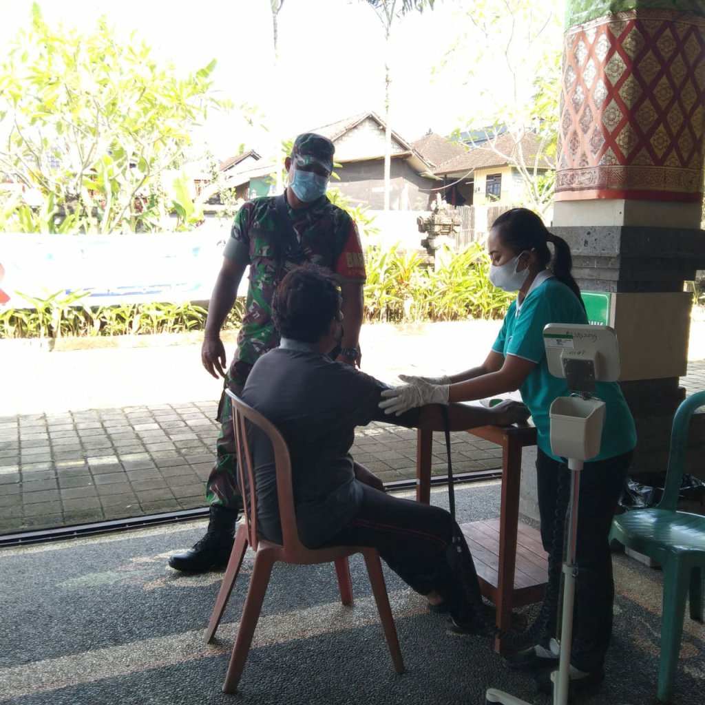 Jembrana – Babinsa Jajaran Kodim 1617/Jembrana terus beri pendampingan dan sosialisasi vaksinasi covid-19 di wilayah binaan masing masing dalam mendukung percepatan program vaksinasi nasional. Bersinergi dengan aparat terkait para Babinsa secara aktif memberikan pendampingan dan pengamanan agar proses vaksinasi berjalan dengan lancar dan mensosialisasikan kepada masyarakat bahwa vaksinasi aman dan sangat penting dalam memutus penyebaran Covid-19.