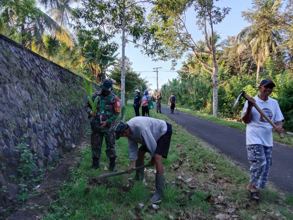 Jembrana – Babinsa Desa Candikusuma Koramil 1617-03/Melaya Serka Dewa Budiwilantara bersama warga melaksanakan pembersihan sekaligus penanaman pohon. Penanaman pohon tersebut dilakukan dalam rangka mensukseskan pencanangan Bulan Bhakti Gotong Royong Masyarakat Ke XIX Tahun 2022 Kabupaten Jembrana.