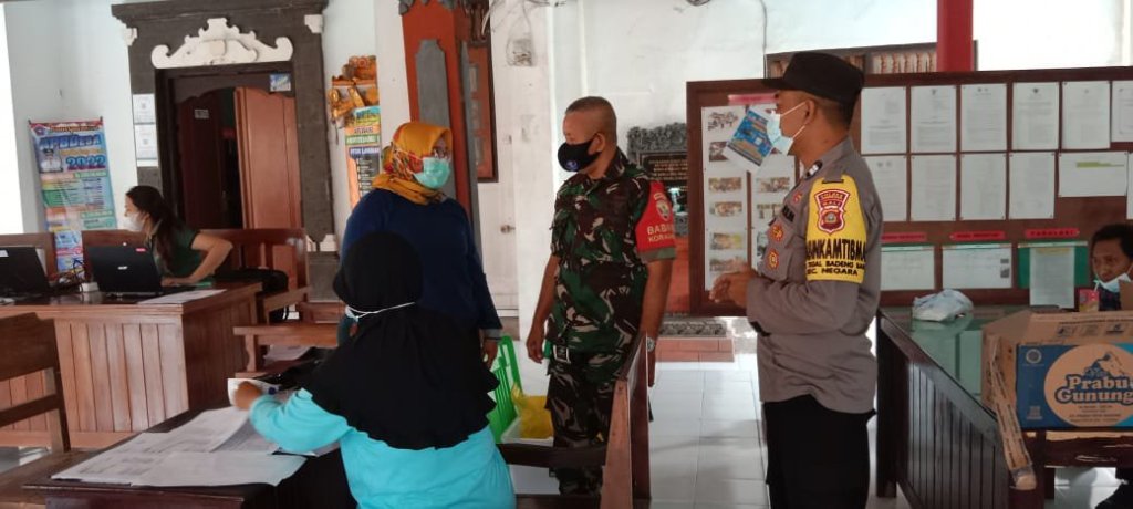 Jembrana – Babinsa Desa Tegalbadeng Barat Koramil 1617-01/Negara Serda Sahnir bersama Bhabinkamtibmas memberikan pendampingan kepada Tim Vaksinator saat berlangsungnya vaksinasi Covid-19. Vaksinasi yang berlangsung di Aula Kantor Desa Tegalbadeng Barat, Kecamatan Negara, Kabupaten Jembrana tersebut merupakan vaksinasi tahap ketiga (Booster) yang diberikan kepada lansia dan masyarakat umum, Sabtu (04/06/2022).
