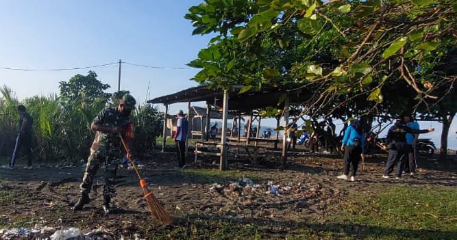 Aksi pembersihan lingkungan yang dilakukan oleh Babinsa Desa Banyubiru bersama Aparat Pemerintah Desa bersama warga bahu membahu membersihkan sampah organik maupun non organik di areal pantai Pebuahan yang merupakan salah satu lokasi destinasi lokal wisata kuliner yang ada di wilayah Kecamatan Negara, Sabtu (04/06/2022)