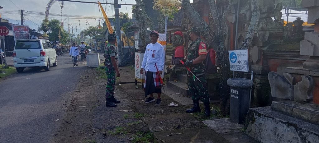 Jembrana – Ditengah aktivitas Umat Hindu melaksanakan persembahyangan hari raya Galungan, penerapan protokol kesehatan dimasa Pandemi Covid-19 yang saat ini telah berada di status PPKM level I menjadi faktor yang harus dipatuhi bersama. Untuk memastikan penerapan protokol kesehatan dalam pelaksanaan persembahyangan Hari Raya Galungan tersebut Babinsa jajaran Kodim 1617/Jembrana bersinergi dengan Pecalang serta aparat terkait berperan aktif mengamankan sekaligus menghimbau Umat Hindu yang hendak melaksanakan persembahyangan untuk tetap selalu mematuhi Protkes dimasing-masing desa binaannya, walupun Covid-19 sampai saat ini melandai, Rabu (08/06/2022)