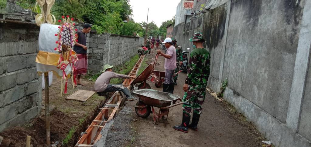 Jembrana – Semangat Gotong Royong terlihat saat Anggota TNI dari Kodim 1617/Jembrana bersama warga melaksanakan karya bakti pembuatan drainase jalan di Lingkungan Tinyeb, Kelurahan Banjar Tengah, Kecamatan Negara. Dipimpin langsung oleh Pasiter Kodim 1617/Jembrana Kapten Inf I Nyoman Gde Andika, SH pembuatan drainase dilakukan sepanjang 250 meter dengan lebar 40 cm dan tinggi 40 cm.