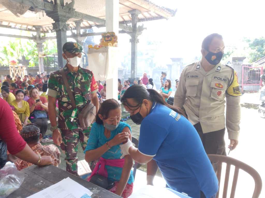 Jembrana – Meski vaksinasi booster di wilayah Kabupaten Jembrana telah tercapai lebih dari 70% namun percepatan vaksinasi kepada seluruh lapisan masyarakat terus digelar diberbagai wilayah oleh Dinas Kesehatan Kabupaten Jembrana. Kodim 1617/Jembrana beserta jajarannya secara konsisten terus mendukung dengan keterlibatan para Babinsa dalam memberikan pendampingan vaksinasi di wilayah binaannya.