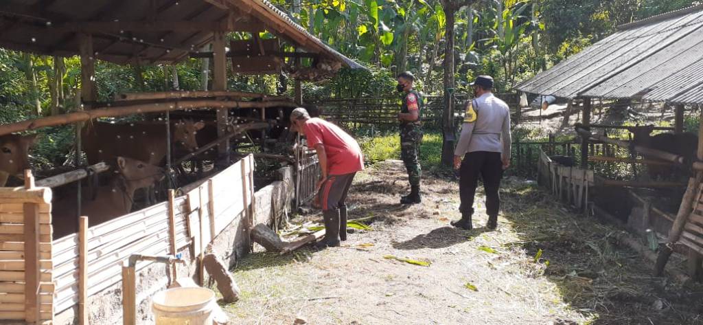 Jembrana – Babinsa Desa Pergung Koramil 1617-02/ Mendoyo Serda Made Budi Ardita bersama Bhabinkamtibmas memberikan pendampingan saat dilakukannya pengecekan terhadap adanya indikasi suspek Penyakit Mulut dan Kaki (PMK) di kandang sapi Simantri Amerta Sari 307, Banjar Petapan Kelod Desa Pergung. Pengecekan sapi yang disinyalir suspek PKM tersebut dilakukan langsung oleh Kepala Dinas Pertanian dan Pangan Kabupaten Jembrana, Sabtu (02/07/2022).