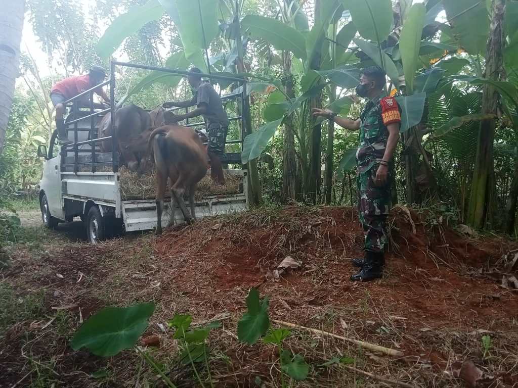 Seperti halnya pengangkutan sapi yang berlangsung di Kandang Sapi Simantri Amerta Sari 308 Banjar Petapan Kelod, Desa Pergung, Babinsa Pergung Koramil 1617-02 Mendoyo Serda Budi Ardita turun langsung memantau dan membantu kelancaran proses pengangkutannya.