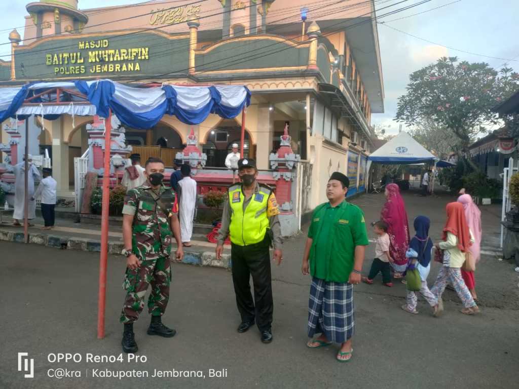 Jembrana – Kodim 1617/Jembrana beserta jajarannya melaksanakan pemantauan dan pengamanan Sholat Ied hari Raya Idul Adha 1443 Hijriah. Bersinergi dengan unsur pengamanan dari Polres Jembrana dan Instansi terkait, terlihat personel Kodim 1617/Jembrana memberi pengamanan kepada Umat Muslim yang sedang melaksanakan Ibadah Sholat Ied di sejumlah Masjid di Wilayah Kabupaten Jembrana, Minggu (10/7).