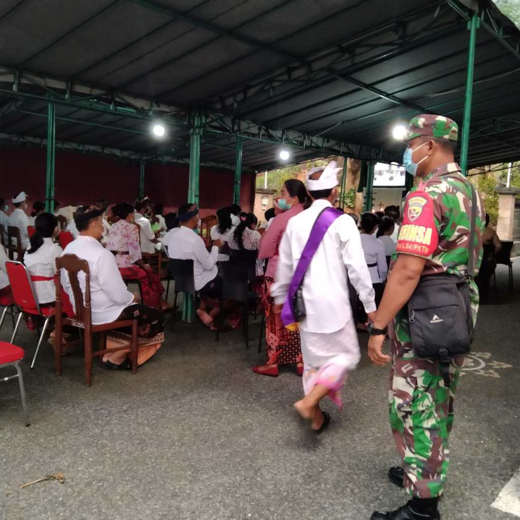 Jembrana – Babinsa Jajaran Kodim 1617/Jembrana memberikan pengamanan dan kenyamanan saat umat Nasrani melaksanakan Ibadah Hari Minggu di sejumlah Gereja di wilayah Kabupaten Jembrana. Pengamanan pun dilakukan bersinergi dengan aparat kepolisian serta unsur pengamanan dari pihak gereja, Minggu (17/)7).