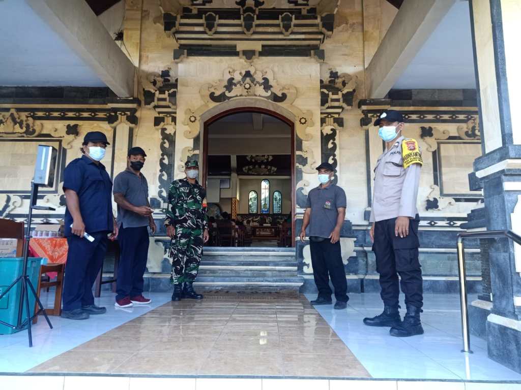 Jembrana -Sejumlah gereja menjadi atensi para Babinsa Jajaran Kodim 1617/Jembrana dalam memberikan rasa nyaman dan khidmad saat warga melaksanakan Ibadah hari minggu. Terpantau saat umat Nasrani melaksanakan Ibadah Hari Minggu, Babinsa pun hadir untuk memberikan himbauan disiplin Prokes kepada Jemaat yang hadir.