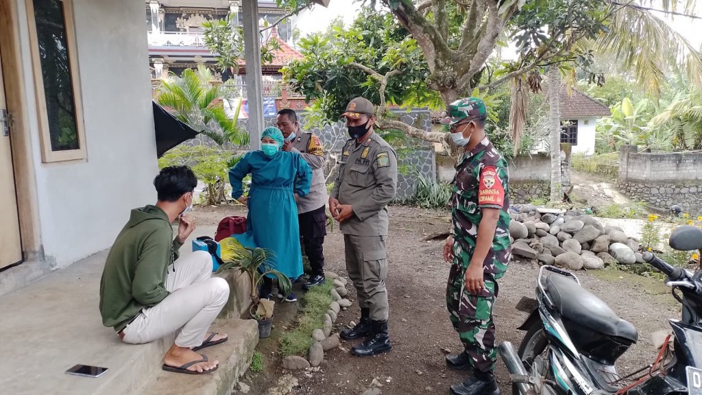 Jembrana – Babinsa Medewi Koramil 1617-04/Pekutatan Serka Masduki memberikan pendampingan saat Tim Tracer Puskesmas I Pekutatan melakukan testing dan tracing kontak erat terhadap beberapa orang warga di Banjar Delod Setra, Desa Medewi, Kecamatan Pekutatan. Testing dan tracing kontak erat dilakukan setelah adanya warga yang terkonfirmasi Positif Covid-19, Rabu (7/9).