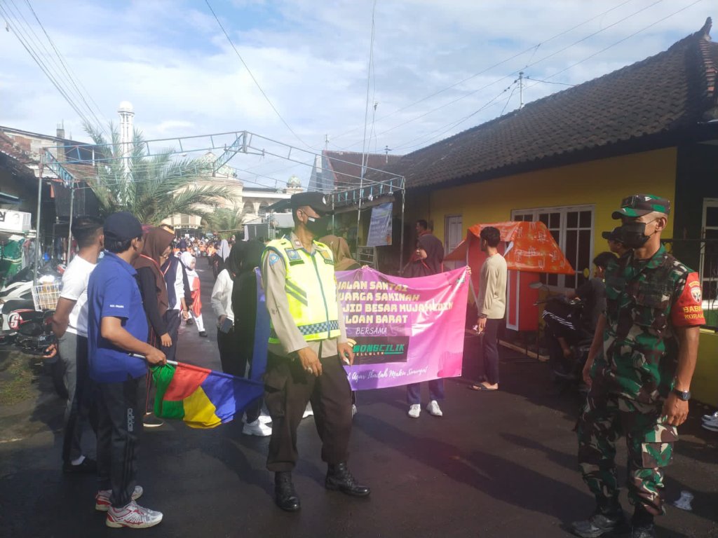 Jembrana – Babinsa Kelurahan Loloan Barat Koramil 1617-01/Negara melaksanakan pengamanan jalan santai dalam rangkaian peringatan Maulid Nabi Muhammad SAW 1444 H. Dalam memberikan pengamanan Babinsa Kelurahan Loloan Barat bersinergi dengan Bhabinkamtibmas dan Polkel Loloan Barat, Minggu (9/06).