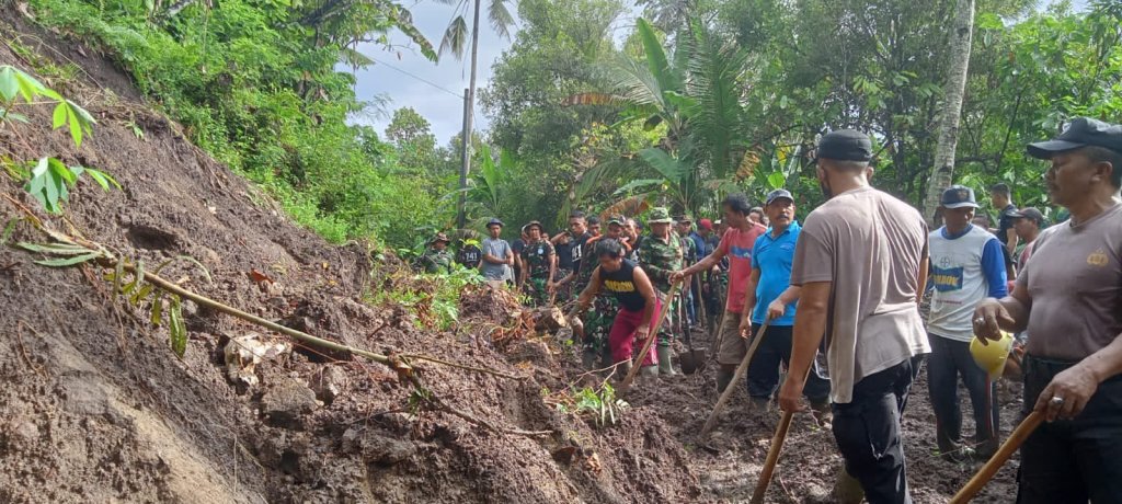 Jembrana – Kodim 1617/Jembrana menerjunkan puluhan personelnya dalam mengikuti karya bakti pembersihan badan jalan akibat tanah longsor di Desa Yehembang Kauh, Kecamatan Mendoyo Kabupaten Jembrana, Minggu (9/10).