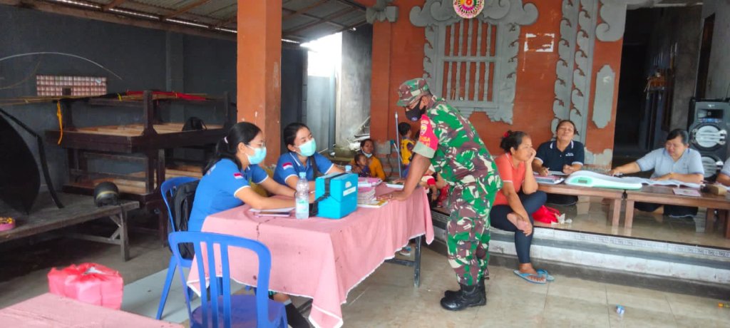 Jembrana – Babinsa Batuagung Koramil 1617-01/Negara Pelda Nyoman Suarken memberikan pendampingan pelayanan Posyandu bagi Balita yang diselenggarakan oleh Puskesmas Pembantu Batuagung. Kegiatan Posyandu berupa penimbangan dan imunisasi Balita berlangsung di Banjar Tegalasih, Desa Batuagung, Kecamatan Jembrana, Kabupaten Jembrana, Sabtu (15/10/2022).