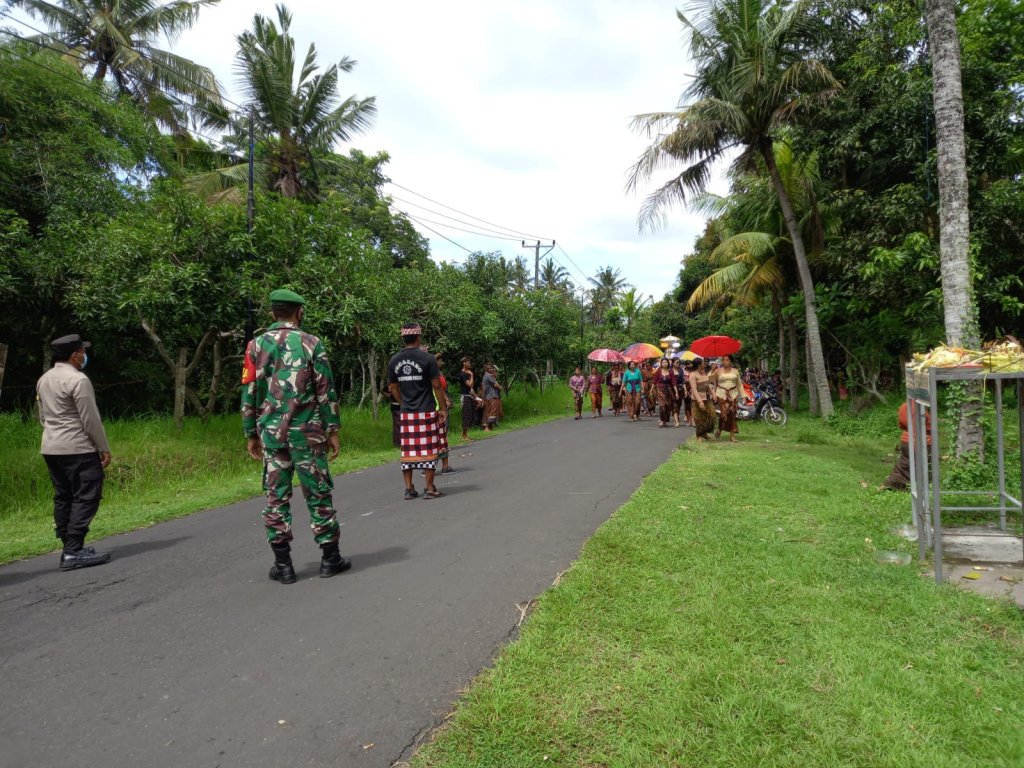 Jembrana – Babinsa Perancak Koramil 1617-01/Negara Serma I Komang Soyen turut memberikan pengamanan saat berlangsungnya pengabenan salah satu warga di desa binaan. Dalam melaksanakan pengamanan, Babinsa Perancak bersinergi dengan Bhabinkamtibmas dan unsur pengamanan dari Pecalang Desa Adat setempat, Jumat (28/10).