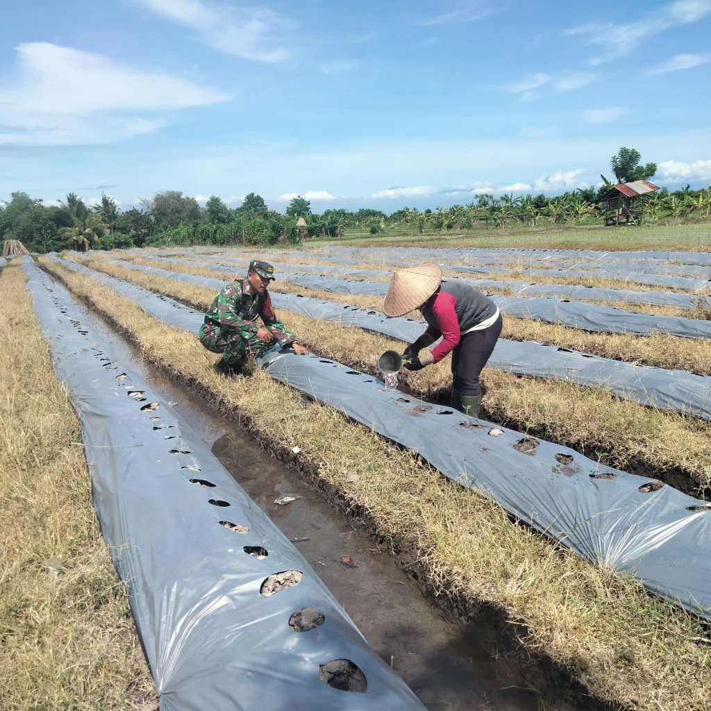 Jembrana – Babinsa Lelateng Koramil 1617-01/Negara Sertu Edi Suharno bersama warga melakukan penanaman bibit cabe. Bibit cabe yang ditanam tersebut merupakan bantuan Pemerintah Kabupaten Jembrana dalam program ketahanan pangan, Senin (31/10).