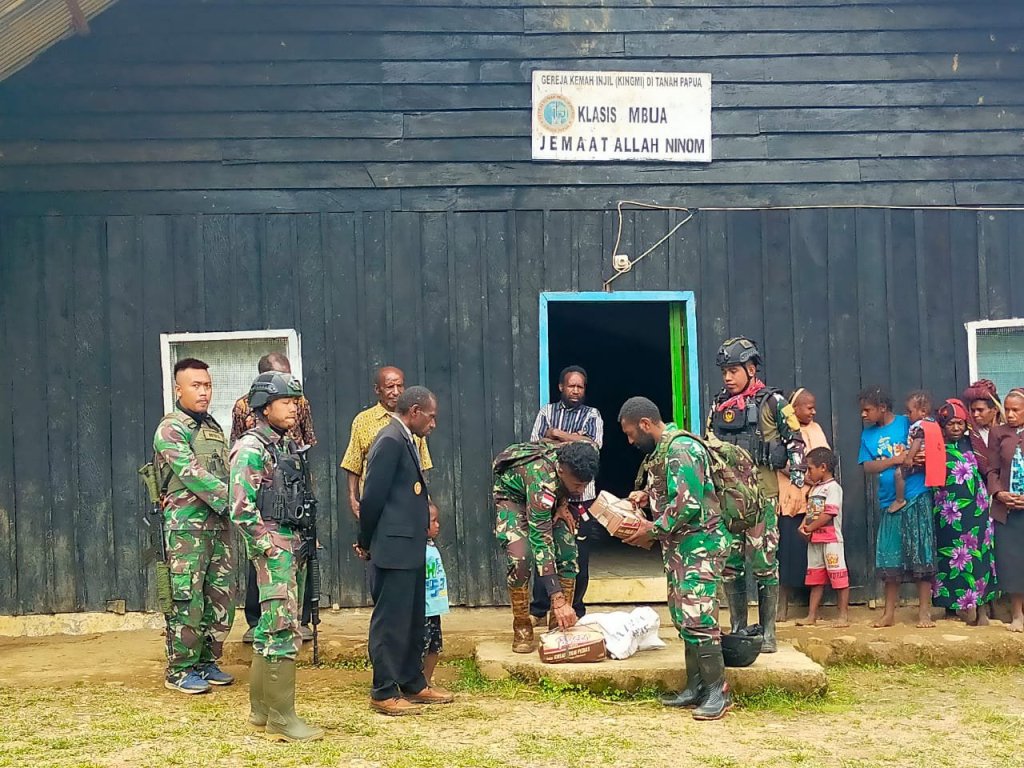 Papua | Mbua – Puluhan personil Kodam IX/ udayana yang sedang melaksanakan penugasan di wilayah indonesia bagian timur tepatnya di Distrik Mbua, Provinsi Papua melakukan pengamanan persembahyangan dan penyerahan sembako di Gereja Digilmo Distrik Mbua. Kegiatan pengamanan tersebut dilakukan sebagai salah satu cara untuk memberikan rasa aman dan nyaman kepada warga masyarakat binaan yang sedang melaksanakan ibadah mingguan di Gereja Digilmo. Minggu (13/11/2022)