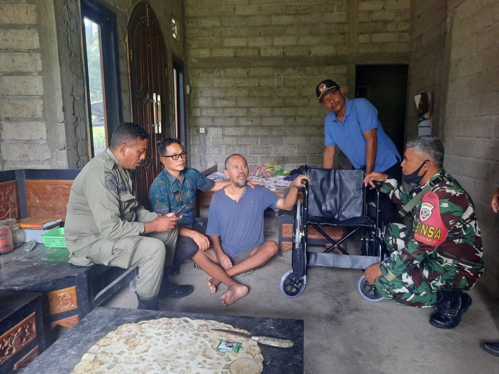 Jembrana – Babinsa Melaya Koramil 1617-03/Melaya Sertu I Gede Sujana bersama Perbekel Melaya I Kadek Wastra didampingi Staf Desa Melaya dan Poldes menyambangi rumah salah satu warga. Kedatangan Babinsa bersama Perbekel Desa Melaya tersebut guna menyerahkan bantuan kursi roda terhadap warganya, Selasa (22/11).