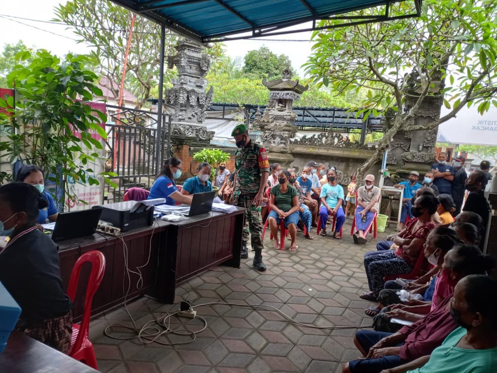 Jembrana – Babinsa Perancak Koramil 1617-01/Negara Serma I Komang Soyen memberikan pendampingan kepada Tim Vaksinator Puskesmas II Jembrana saat berlangsungnya Vaksinasi Covid-19. Vaksinasi yang berlangsung di Kantor Desa Perancak, Kecamatan Jembrana, Kabupaten Jembrana tersebut merupakan Vaksinasi Booster tahap kedua diberikan kepada lansia, Jumat (16/12).
