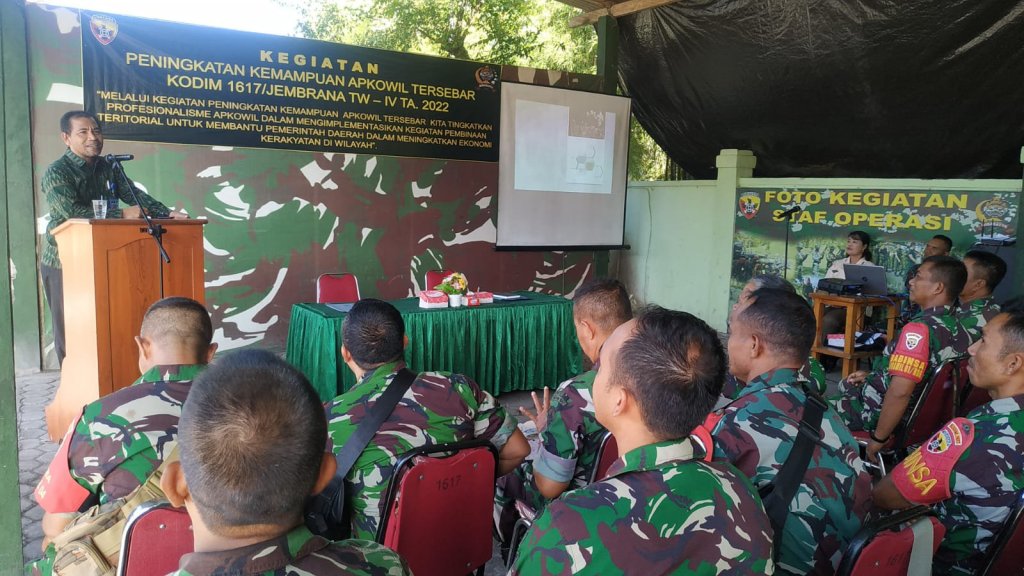 Jembrana – Guna meningkatkan kemampuan prajurit terutama para Babinsa dalam melaksanakan tugas di wilayah binaan, Kodim 1617/Jembrana melaksanakan kegiatan peningkatan kemampuan Aparat Komando Kewilayahan (Apkowil) Tahun 2022. Kegiatan tersebut berlangsung di Kantor Makodim 1617/ Jembrana Jalan Ngurah Rai No 135 Negara, Selasa (20/12).