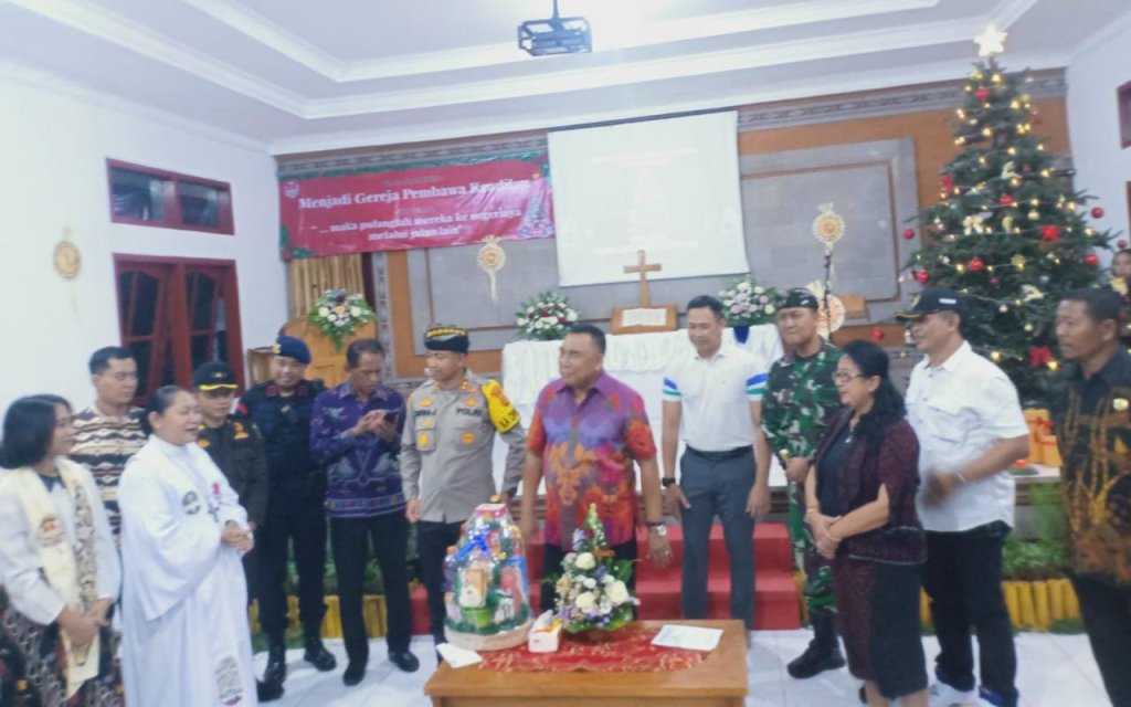 Jembrana – Dandim 1617/ Jembrana Bersama Forkopimda Kabupaten Jembrana memantau langsung perayaaan Malam Kudus Tahun 2022 ke sejumlah Gereja yang tersebar di Kabupaten Jembrana. Monitoring ke sejumlah gereja dilakukan guna memastikan Ibadah Malam Kudus berjalan dengan aman dan lancar, Jumat malam (24/12).
