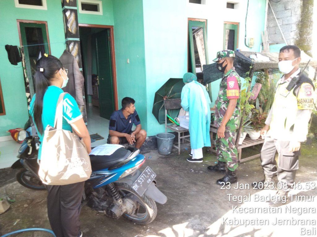 Jembrana – Babinsa Desa Tegal Badeng Timur, Koramil 1617-01/Negara, bersinergi dengan Babinkamtibmas memberikan pendampingan sekaligus pengamanan saat berlangsungnya kegiatan Testing dan Tracing Kontak Erat terhadap warga oleh Tim Tracer dari Puskesmas II Negara, Senin (23/01).