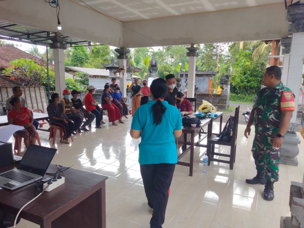 Jembrana – Babinsa Mendoyo Dauh Tukad, Koramil 1617-02/Mendoyo Serka I Putu Yuniar memberikan pendampingan Tim Vaksinator Puskesmas I Mendoyo saat berlangsungnya Vaksinasi Covid-19. Vaksinasi yang berlangsung di Balai Banjar Gunung Sekar, Kecamatan Mendoyo, Kabupaten Jembrana tersebut merupakan Vaksinasi Booster kedua diberikan kepada lansia, Sabtu (28/01).