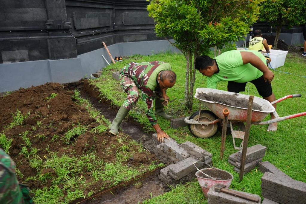 Jembrana – Guna mempercantik Makodim 1617/Jembrana, Anggota Kodim 1617/Jembrana giat benahi pangkalan, dalam hal ini adalah pembuatan panggung permanen di halaman depan Makodim yang mana kedepanya bisa berguna untuk kegiatan acara ceremonial maupun resmi yang diselenggarakan di Makodim 1617/Jembrana, Ngurah Rai, Dauhwaru, Kec. Jembrana, Kabupaten Jembrana, Bali Selasa, (07/02/2023).
