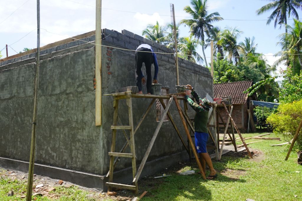 Jembrana – Tanpa mengenal lelah para personil Kodim 1617/Jembrana tetap bekerja di hari minggu guna capai target pembangunan agar dapat selesai tepat waktu di salah satu sasaran program RTLH di Desa Kaliakah, Kecamatan Negara, Kabupaten Jembrana, Minggu (19/02/2023).