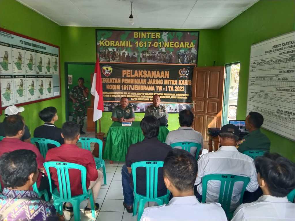 Jembrana – Korem 163/Wira Satya menggelar Pembinaan Jaring Mitra Karib Kodim 1617/Jembrana TW I TA. 2023 di Wilayah Koramil 1617-01/Negara, Kabupaten Jembrana dengan mengambil tema “Mewujudkan Binter TNI AD yang adaptif melalui pembinaan jaring mitra karib di wilayah guna mengoptimalkan deteksi dini, cegah dini, temu cepat dan lapor cepat bagi Apkowil” acara berlangsung di Aula Koramil 1617-01/Negara, Rabu (15/03/2023).