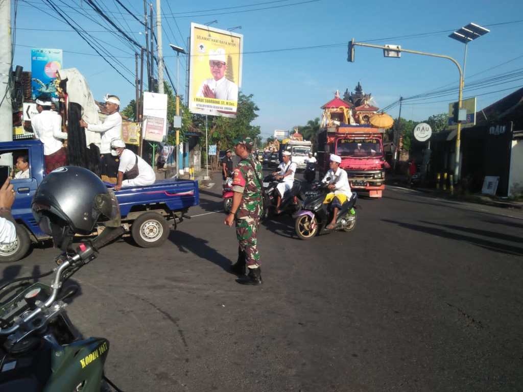 Jembrana – Dalam rangka menjaga keamanan dan kelancaran dalam pelaksanaan persembahangan Melasti menjelang hari raya Nyepi Tahun Caka 1945, Tahun 2023, Babinsa jajaran Kodim 1617/Jembrana bersinergi dengan Pecalang serta aparat terkait berperan aktif memberi rasa aman dan nyaman umat Hindu yang hendak melaksanakan persembahyangan dimasing masing desa binaannya, Minggu (19/03/2023).