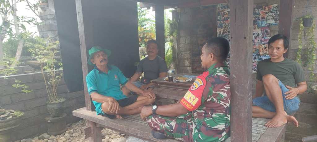 Jembrana – Babinsa Kelurahan Sangkaragung Koramil 1617-01/Negara Serda Yumatrius Koloman melaksanakan komunikasi sosial (Komsos) dengan warga binaan I Kadek Bagus Sastrawan, guna mengetahui perkembangan situasi wilayah binaannya, yang bertempat di Lingkungan Sangkaragung, Kelurahan Sangkaragung Kecamatan Jembrana, Kabupaten Jembrana, Senin (03/04/2023).