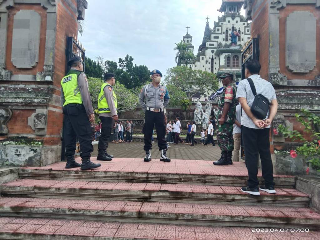 Jembrana – Untuk mengamankan kegiatan masyarakat saat Pelaksanaan Ibadah Jumat Agung, Babinsa Jajaran Kodim 1617/Jembrana bersama Instansi terkait melaksanakan pengamanan. Kegiatan pengamanan Ibadah Jumat Agung dilaksanakan di Gereja Gereja yang ada di Kabupaten Jembrana, Jum’at (07/04/2023).