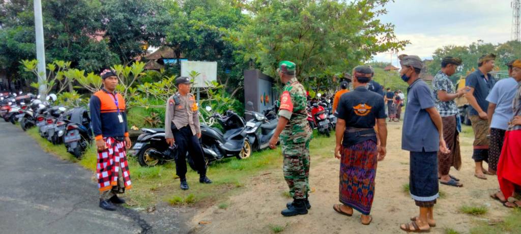 Jembrana – Untuk memberi rasa aman dan nyaman pada pelaksanaan upacara ngaben, Babinsa Desa Batuagung Koramil 1617-01/Negara, Pelda I Nyoman Suarken bersinergi dengan Babinkamtibmas, Polprades dan Pecalang Desa Adat Batuagung melaksanakan pengamanan dan membantu mengatur lalu lintas pada gelaran upacara Pitra Yadnya Ngaben di Setra Desa Adat Batuagung, Desa Batuagung, Kecamatan Jembrana, Kabupaten Jembrana, Jumat (28/04/2023).