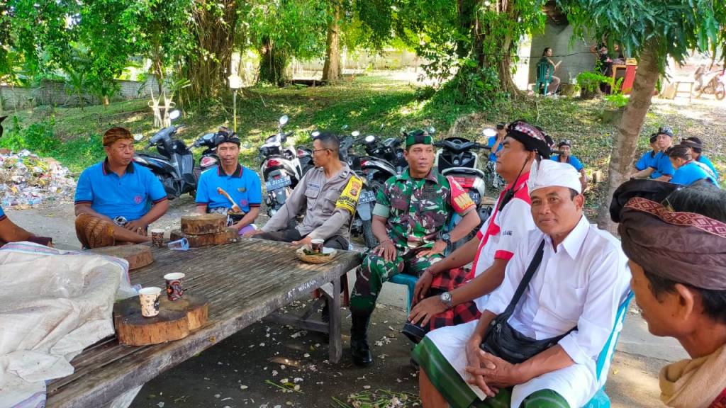 Jembrana – Babinsa Desa Penyaringan Koramil 1617-02/Mendoyo Sertu Nyoman Agus Mahendra bersama Babinkamtibmas Aiptu Made Tomoyasa memantau kegiatan Ucapara Persembahyangan Piodalan Jelih di Pura Dalem Penyaringan, Desa Penyaringan, Kecamatan Mendoyo, Kabupaten Jembrana. Rabu (28/06/2023).