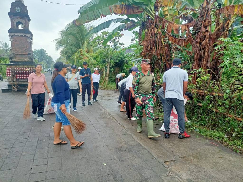 Aksi pembersihan lingkungan yang dilakukan oleh Babinsa, Aparat Pemerintah Desa bersama warga bahu membahu membersihkan sampah organik maupun non organik di Jalan Desa Manistutu, Kecamatan Melaya, Kabupaten Jembrana. Minggu (02/07/2023).