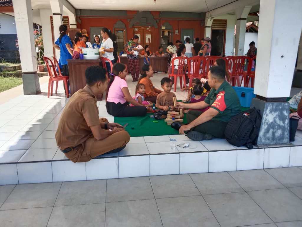 Jembrana – Babinsa Desa Candikusuma, Koramil 1617-03/Melaya, Serka Dewa Budi Wiliantara melakukan pendampingan sekaligus pemantauan dalam kegiatan Posyandu Balita Moding Sari II yang berlangsung di Balai Banjar Moding, Desa Candikusuma, Kecamatan Melaya, Kabupaten Jembrana. Senin (10/07/2023).