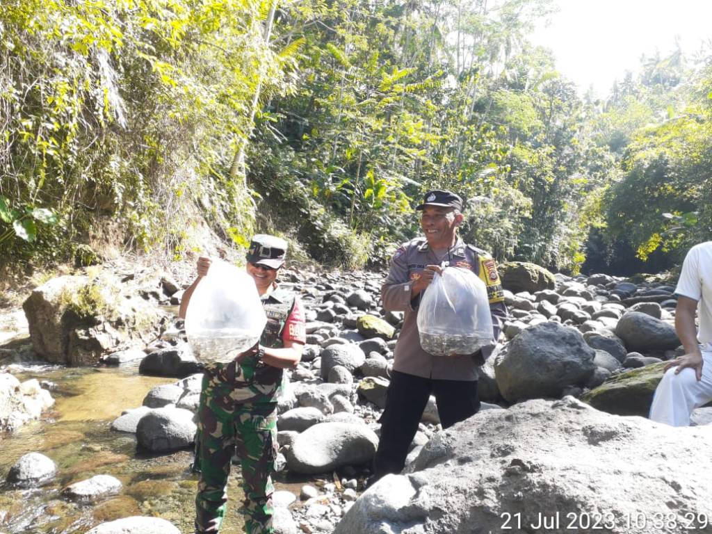 Jembrana – Babinsa Desa Pergung, Koramil 1617-02/Mendoyo, Serda I Made Budi Ardita bersama Bhabinkamtibmas Aiptu I Putu Oka Sandiyasa mengikuti kegiatan Penebaran Bibit Ikan sesuai surat edaran dari Menteri Perikanan dan Kelautan tentang Penebaran bibit ikan di perairan umum guna mengembalikan fungsi dan peran perairan umum sebagai ekosistem akuantik yang seimbang pada perairan tersebut maupun bagi manusia sebagai bahan pangan, bertempat di Perairan umum Sungai Banjar Pangkung Lubang, Kecamatan Mendoyo, Kabupaten Jembrana. Jumat (21/08/2023).