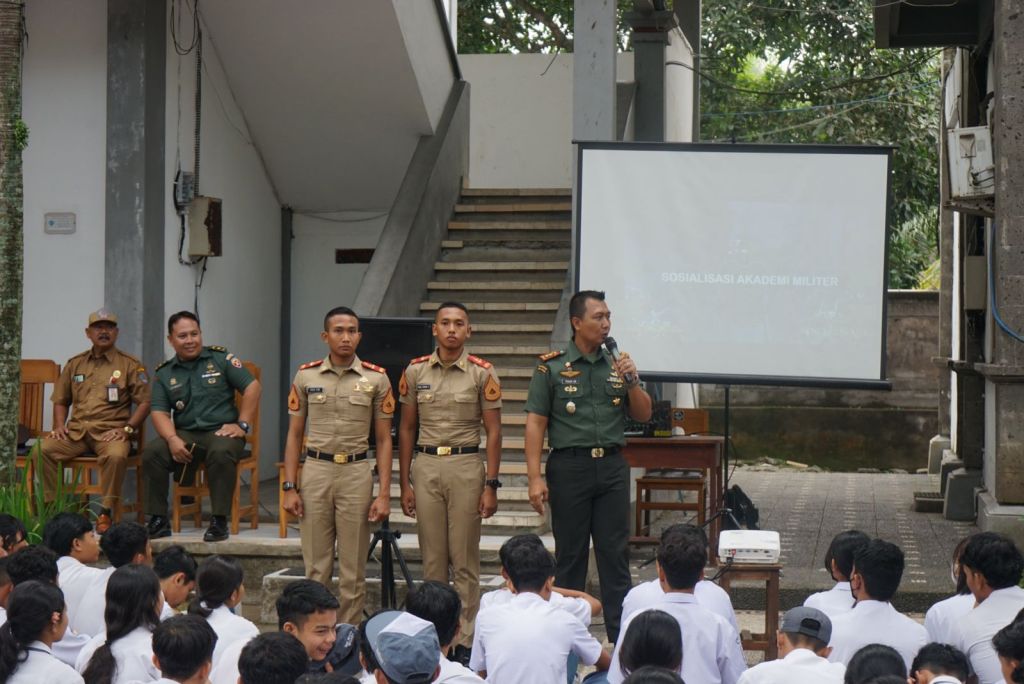 Jembrana – Dandim 1617/Jembrana Letkol Inf Teguh Dwi Raharja, S.Sos memberikan Sosialisasi Wawasan Kebangsaan dan Taruna Akmil di Sekolah SMAN 1 Negara Jln. Ngurah Rai, Kel. Dauhwaru Kecamatan Jembrana, Kabupaten Jembrana. Senin (24/07/2023).