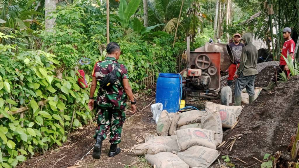 Jembrana – Babinsa Kelurahan Tegalcangkring, Koramil 1617-02/Mendoyo, Serda Suwardi, memantau pelaksanaan kegiatan pengerjaan pembangunan sarana dan prasarana jalan rabat beton sepanjang 87 meter, dengan lebar 2,50 meter serta dengan ketebalan 15 cm, bertempat di Jalan Salak, Gang II, Lingkungan Bilukpoh, Kelurahan Tegalcangkring, Kecamatan Mendoyo, Kabupaten Jembrana. Sabtu (05/08/2023).