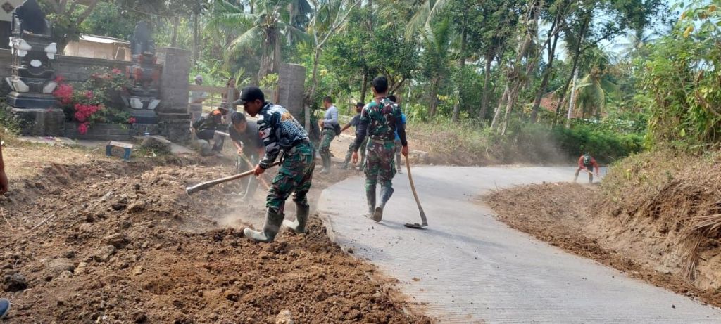 Jembrana – Progres pengecoran Rabat Beton jalan yang dikerjakan Satgas TMMD Ke 118 Kodim 1617/Jembrana Tahun 2023 kali ini sudah mencapai tahap finishing. Hari ini pekerjaan dilanjutkan dengan meratakan tanah di bahu kiri dan kanan rabatan dengan metoda mengangkat timbunan sepanjang selokan agar jalan rabatan tidak terlalu kontras dengan jalan sebelumnya, karena bila dibiarkan akan berbahaya khususnya bagi pengguna jalan yang menggunakan kendaraan bermotor. Minggu (15/10/2023).