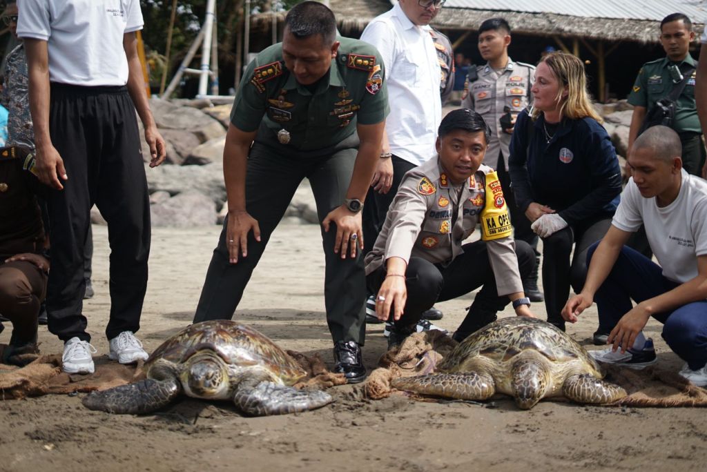 Kegiatan dilanjutkan Pelepasliaran Satwa dilindungi Penyu Hijau ke habitatnya sebanyak 19 ekor hasil dari sitaan Polres Jembrana oleh Forkopimda Kabupaten Jembrana.