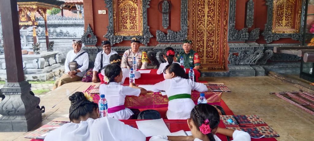 Jembrana – Bulan Bahasa Bali merupakan program prioritas Pemerintah Provinsi Bali dalam upaya pelestarian, pengembangan dan pemajuan Bahasa, Aksara dan Sastra Bali. Babinsa Pulukan Koramil 1617-04/Jembrana bersama Bhabinkamtibmas, Aiptu. Dewa Arta menghadiri undangan dalam rangka kegiatan Bulan Bahasa Bali ke-VI warsa 2024 di Desa Adat Pulukan, Kecamatan Pekutatan, Kabupaten Jembrana dengan tema Jana Kerthi Dharma Sadhu Nuraga”. Kamis (22/02)