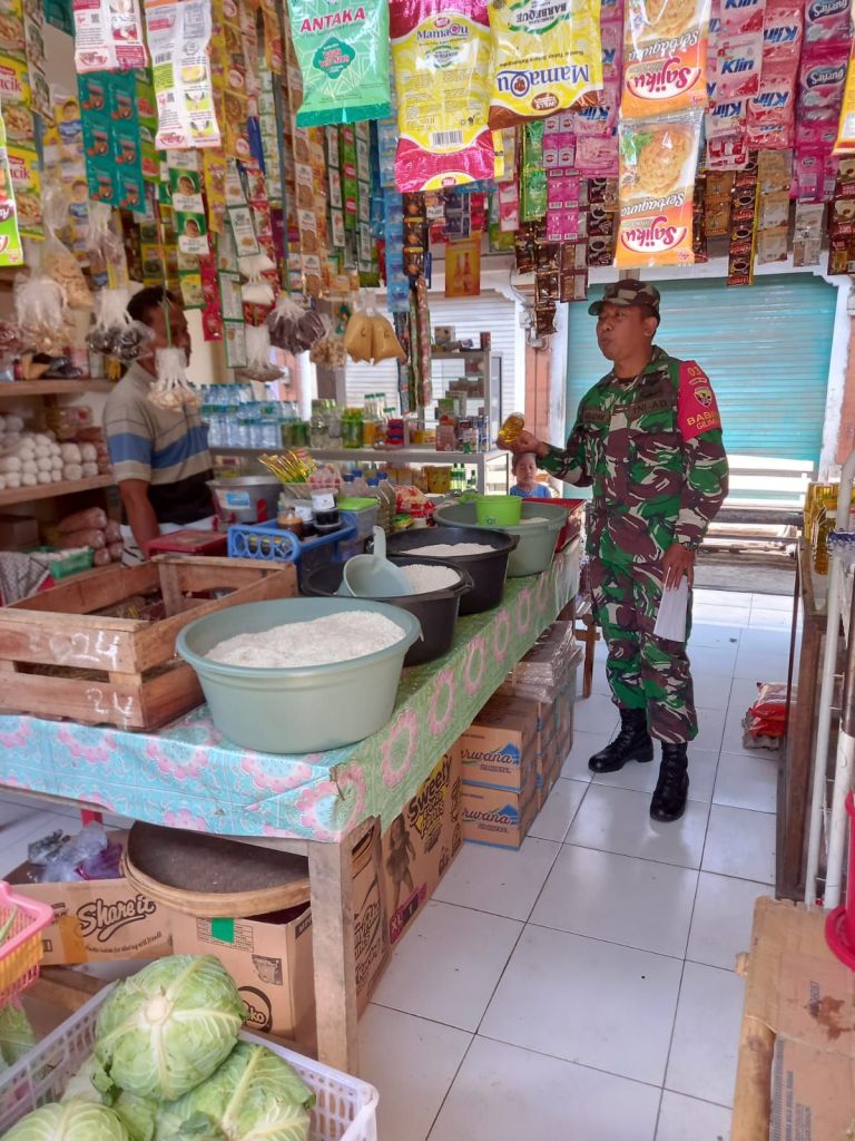 Jembrana – Personil Babinsa Koramil 1617-03/Melaya Kodim 1617/Jembrana Serda Mohammad Adam turun langsung ke Pedagang Sembako di Pasar Umum Gilimanuk dalam rangka mengecek harga bahan pokok untuk mendukung program ketahanan pangan nasional bertempat di Pasar Umum Gilimanuk, Kecamatan melaya Kabupaten Jembrana, Kamis (29/02).